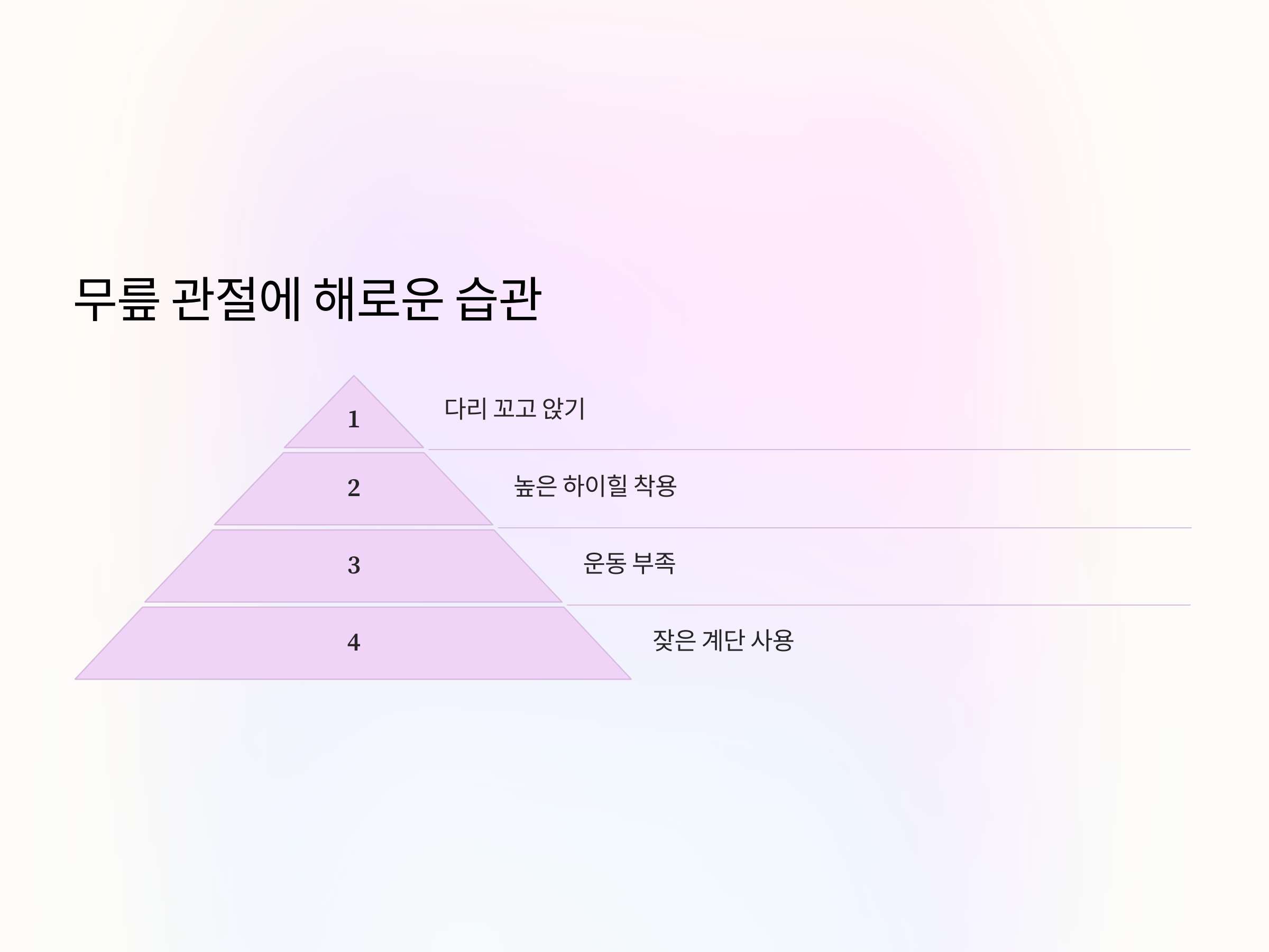 작은 습관을 바꾸는 것만으로도 무릎 건강은 큰 차이를 보일 수 있습니다.