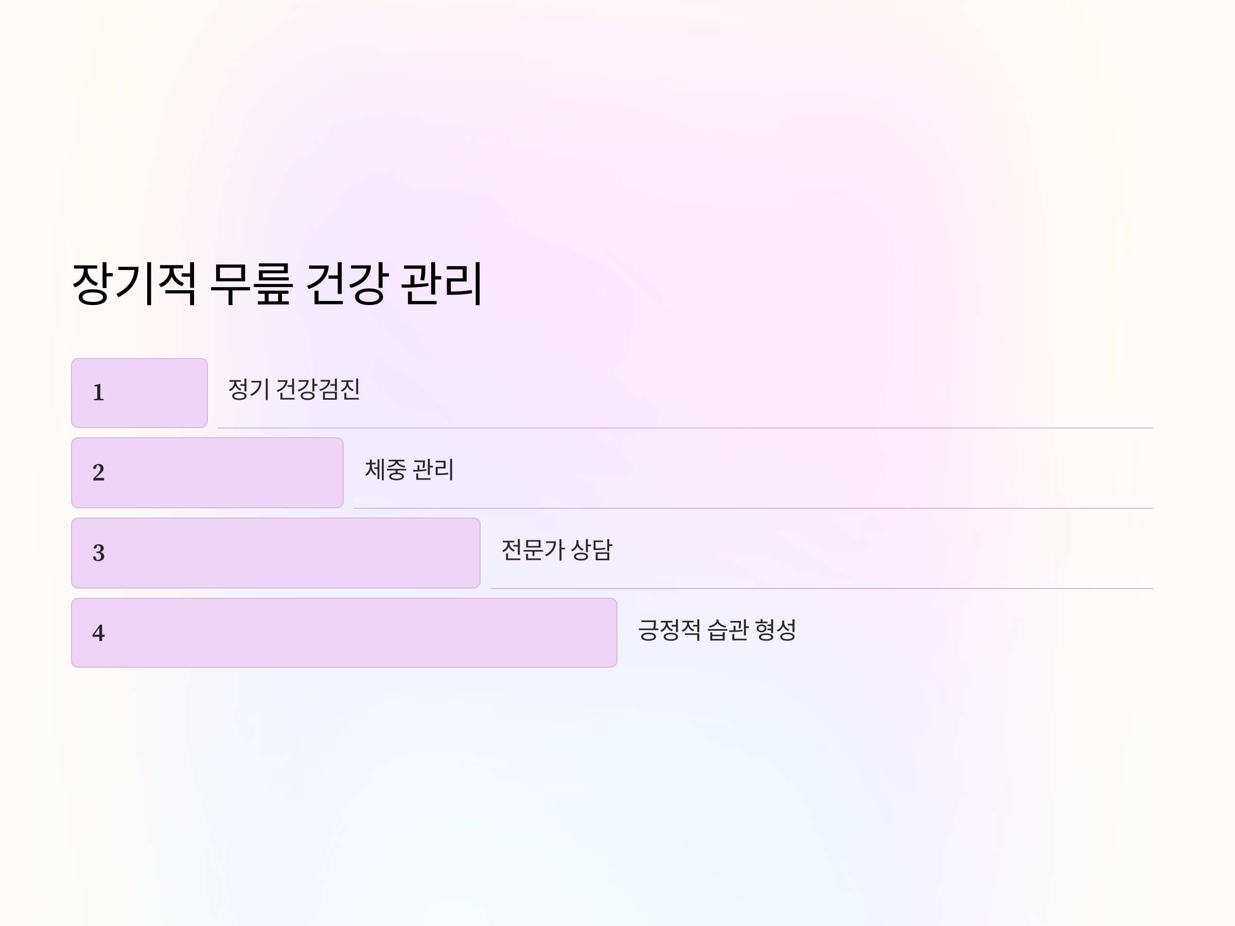 - 정기 건강검진: 관절 건강 상태를 체크하세요.