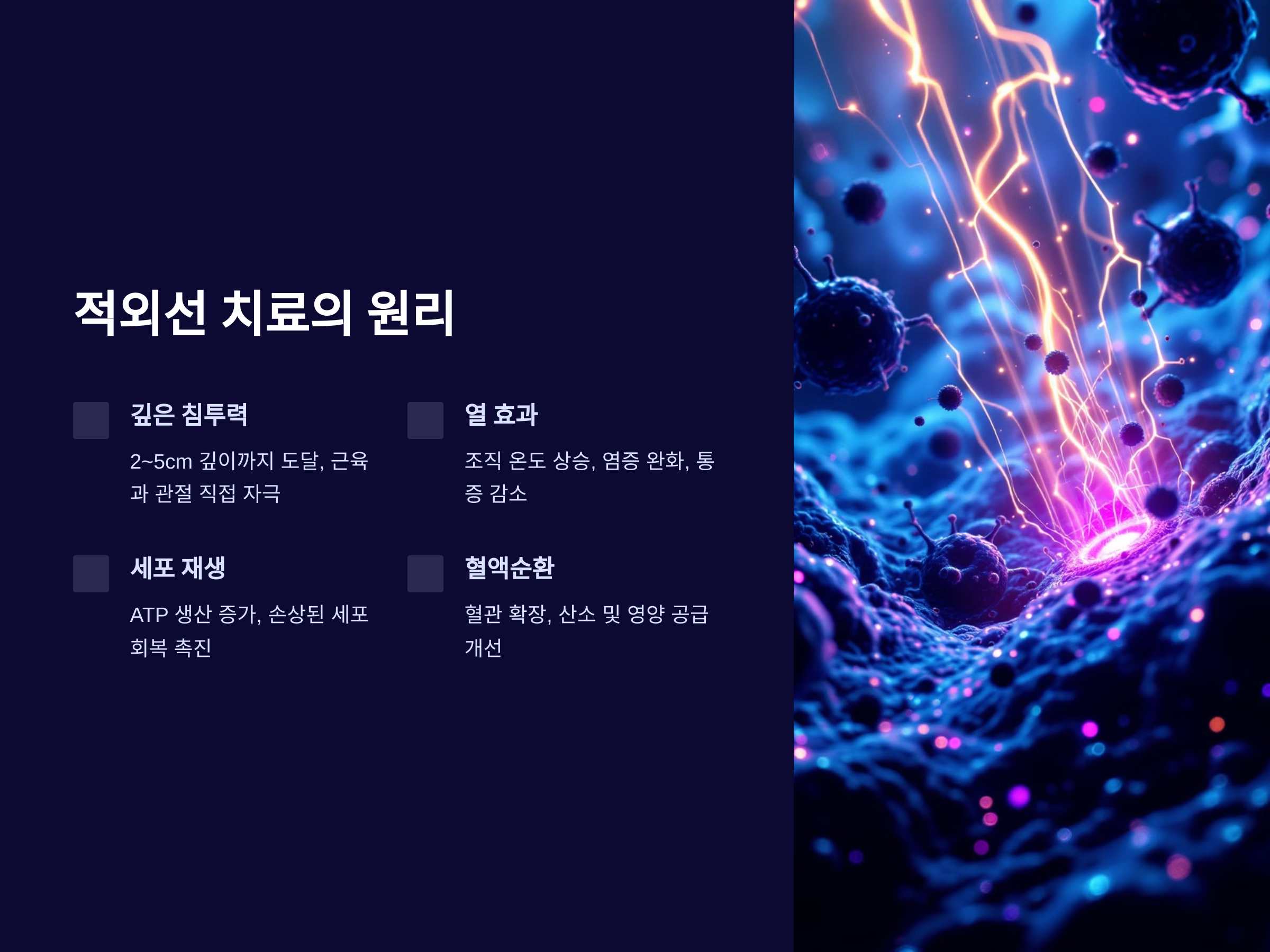 - 침투력: 적외선은 약 2~5cm 깊이까지 침투하여 근육과 관절을 직접 자극합니다.