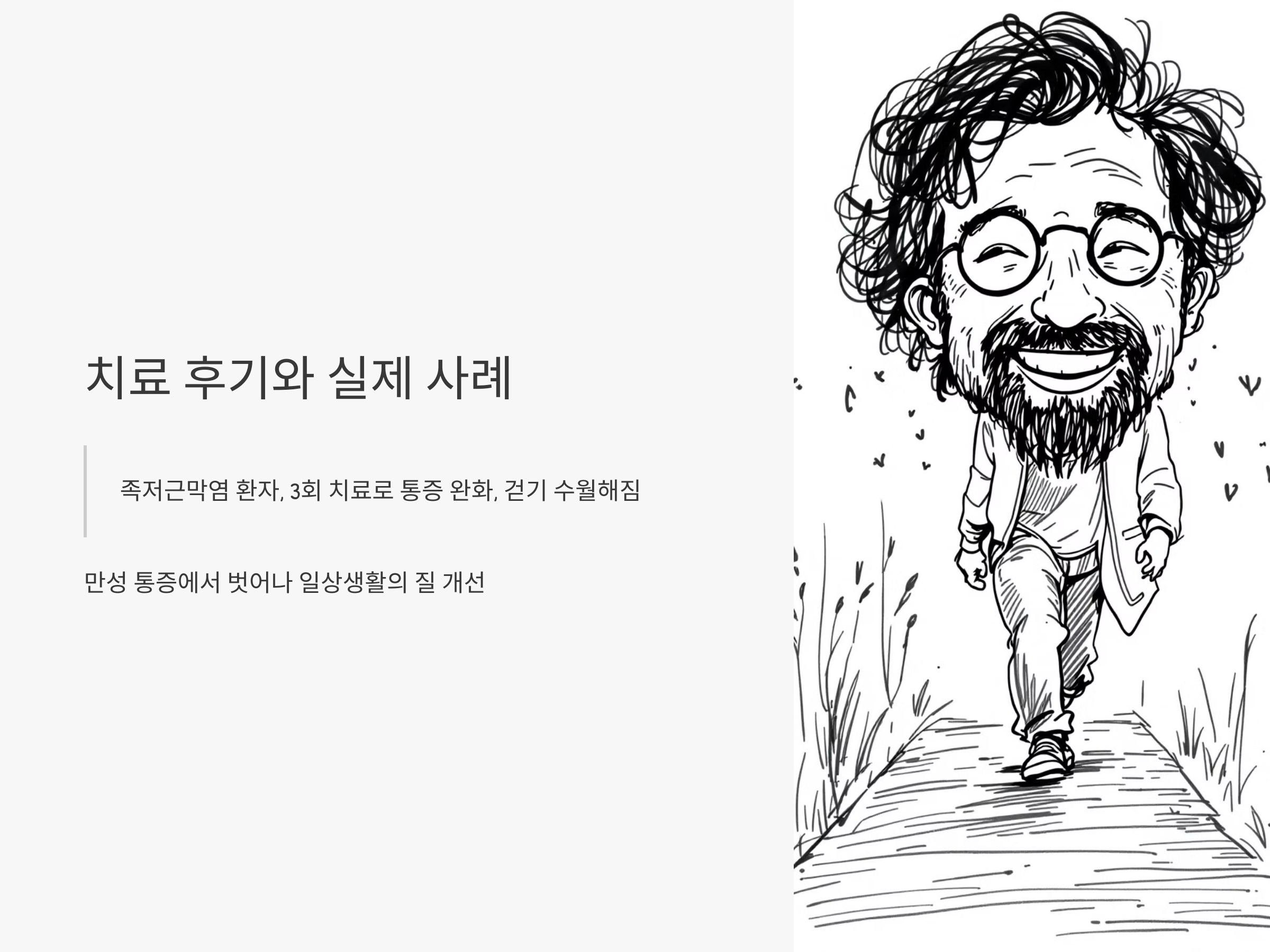 많은 환자들이 체외충격파 치료를 통해 긍정적인 변화를 경험하고 있습니다. 특히, 만성적인 통증에서 벗어나 일상생활의 질이 개선되었다는 후기가 많습니다. 예를 들어, 족저근막염으로 고생하던 한 환자는 3회의 치료만으로 통증이 완화되었고, 걷기가 훨씬 수월해졌다고 말했습니다.