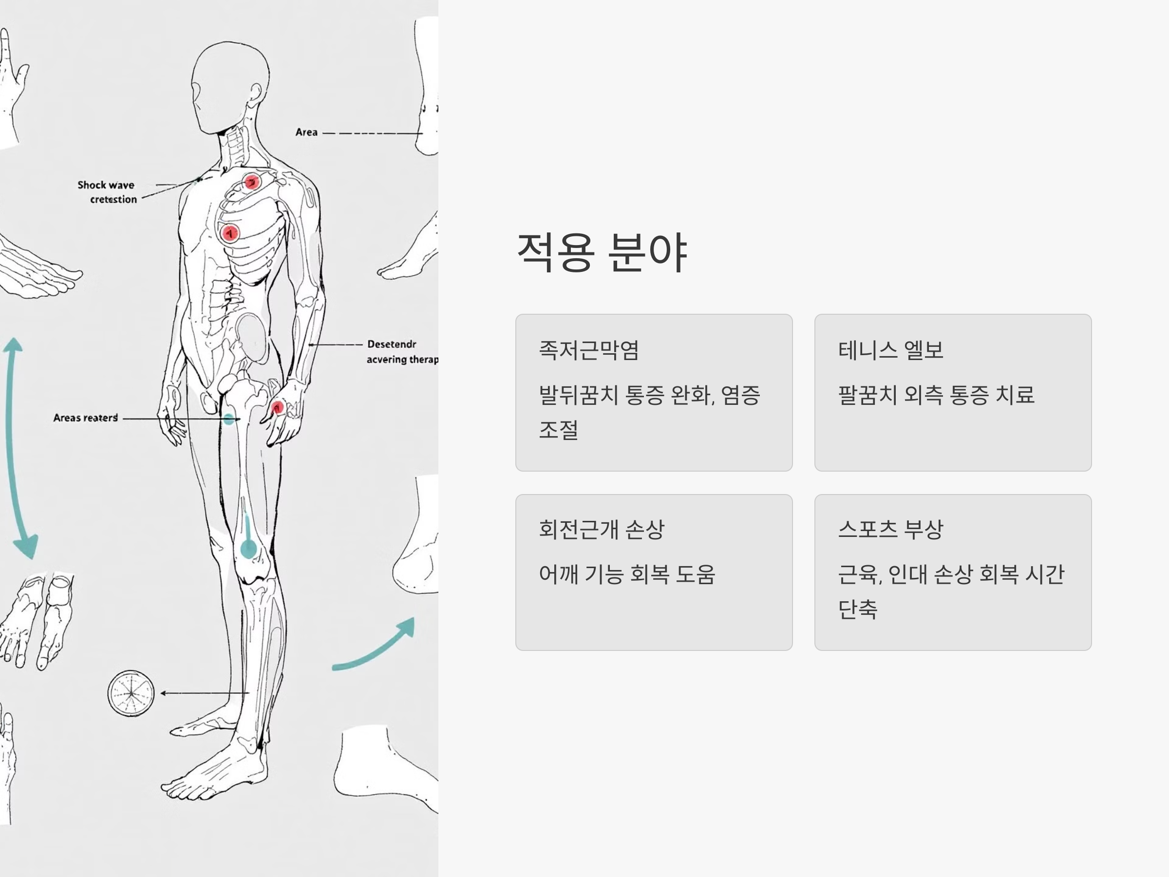 - 광범위한 적용: 근골격계 질환 외에도 비뇨기과, 피부과 등 다양한 분야에서 활용됩니다.