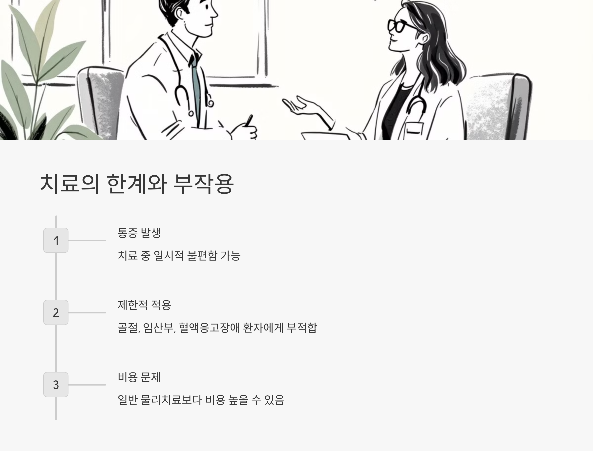 골절이 있는 부위나 임산부, 혈액응고장애 환자 등 일부 환자에게는 권장되지 않습니다. 이러한 제한 사항은 치료 전 의료진과의 충분한 상담을 통해 확인해야 합니다.