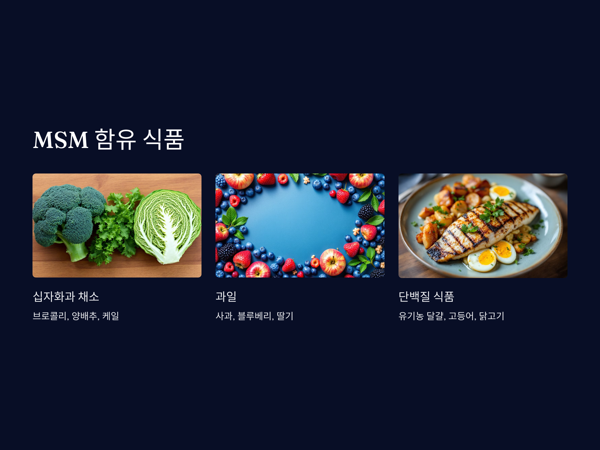 - 비타민 C: MSM의 흡수를 높이고, 항산화 작용을 돕습니다.