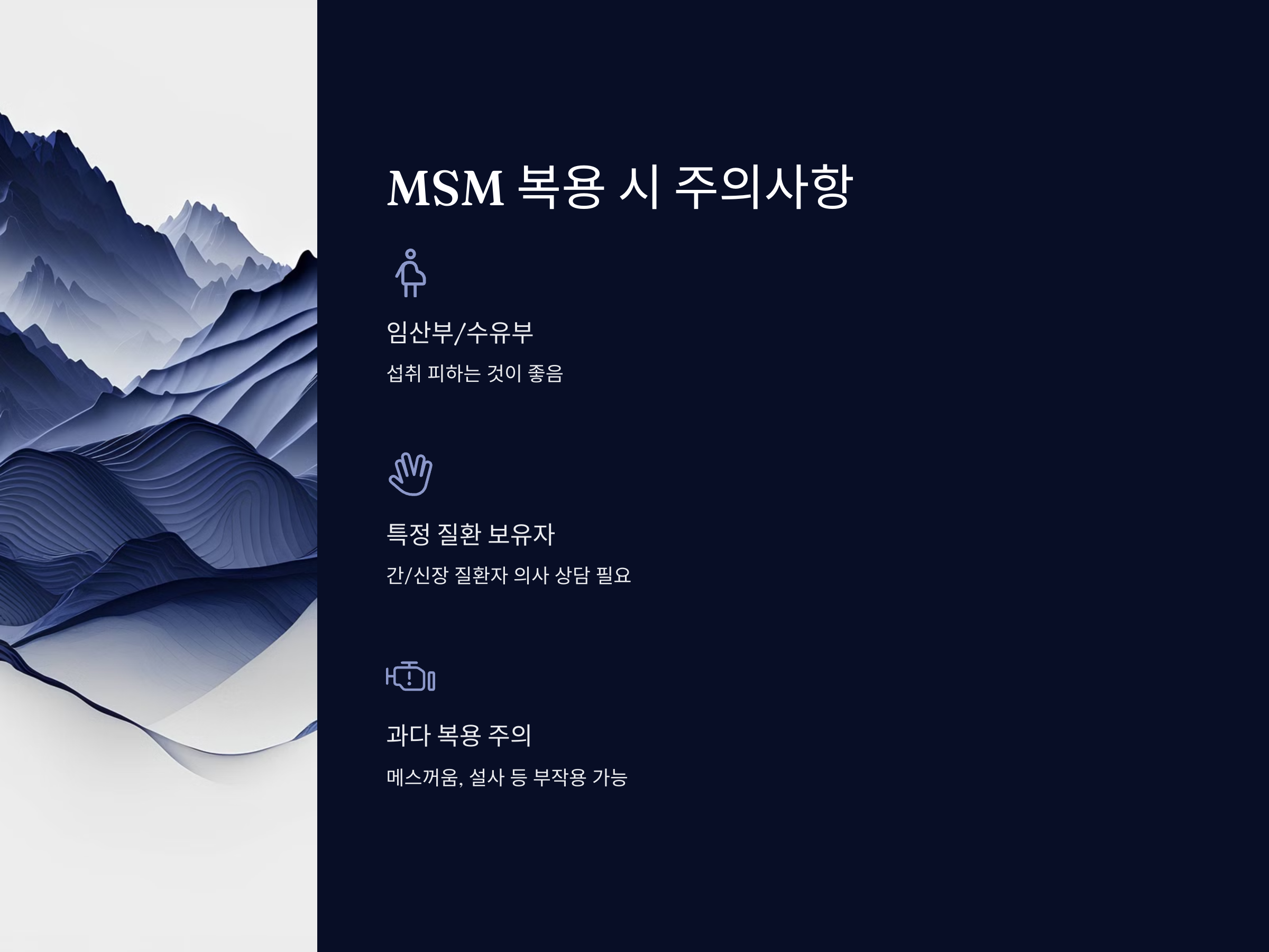 MSM은 비교적 안전한 성분으로 알려져 있지만, 모든 사람에게 적합한 것은 아닙니다. 복용 전 알아야 할 주의 사항은 다음과 같습니다: