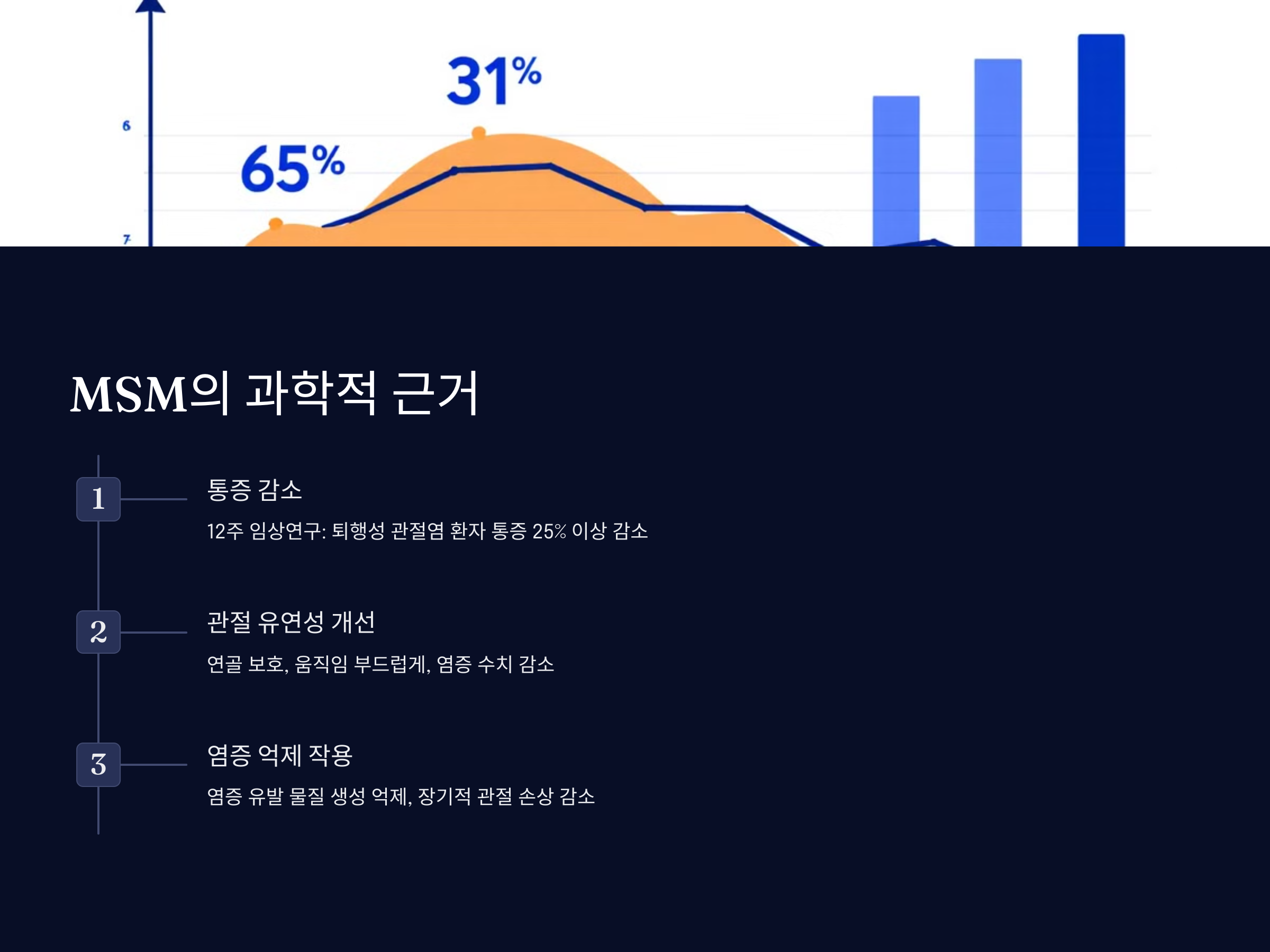 MSM의 관절 건강 효과를 뒷받침하는 과학적 연구가 다수 진행되었습니다. 대표적인 연구 결과는 다음과 같습니다: