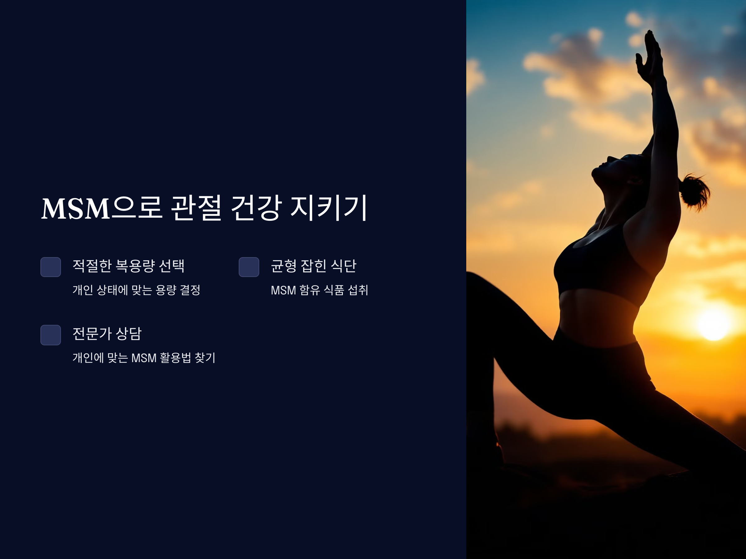 MSM은 관절 건강을 유지하는 데 매우 유익한 성분입니다. 염증 완화, 통증 감소, 연골 보호 등 다양한 효과를 통해 관절 문제를 예방하거나 완화할 수 있습니다. 특히, MSM은 글루코사민, 콘드로이틴 등과 함께 사용할 때 효과가 극대화됩니다.