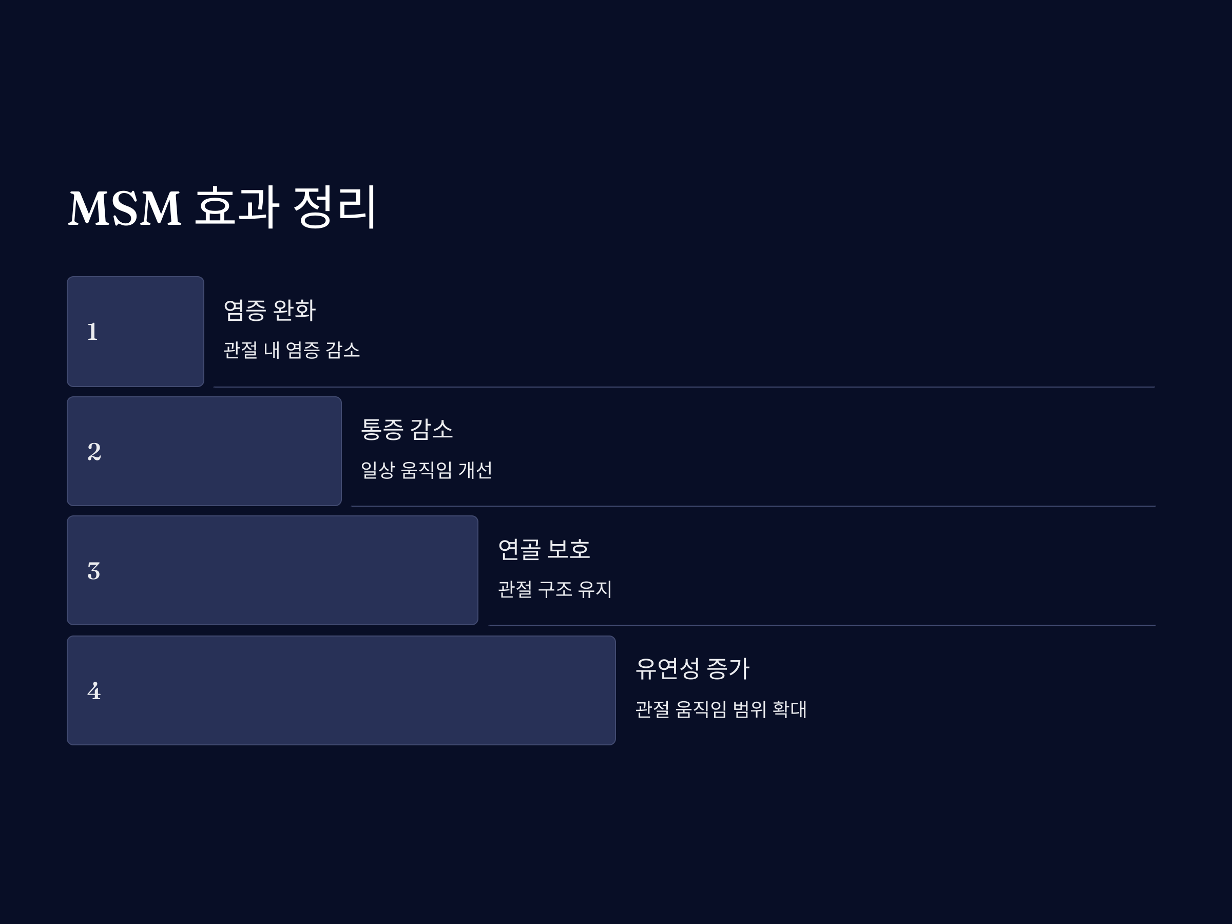 - MSM은 관절 통증 완화뿐 아니라 장기적으로 관절 손상을 줄이는 데 기여합니다.