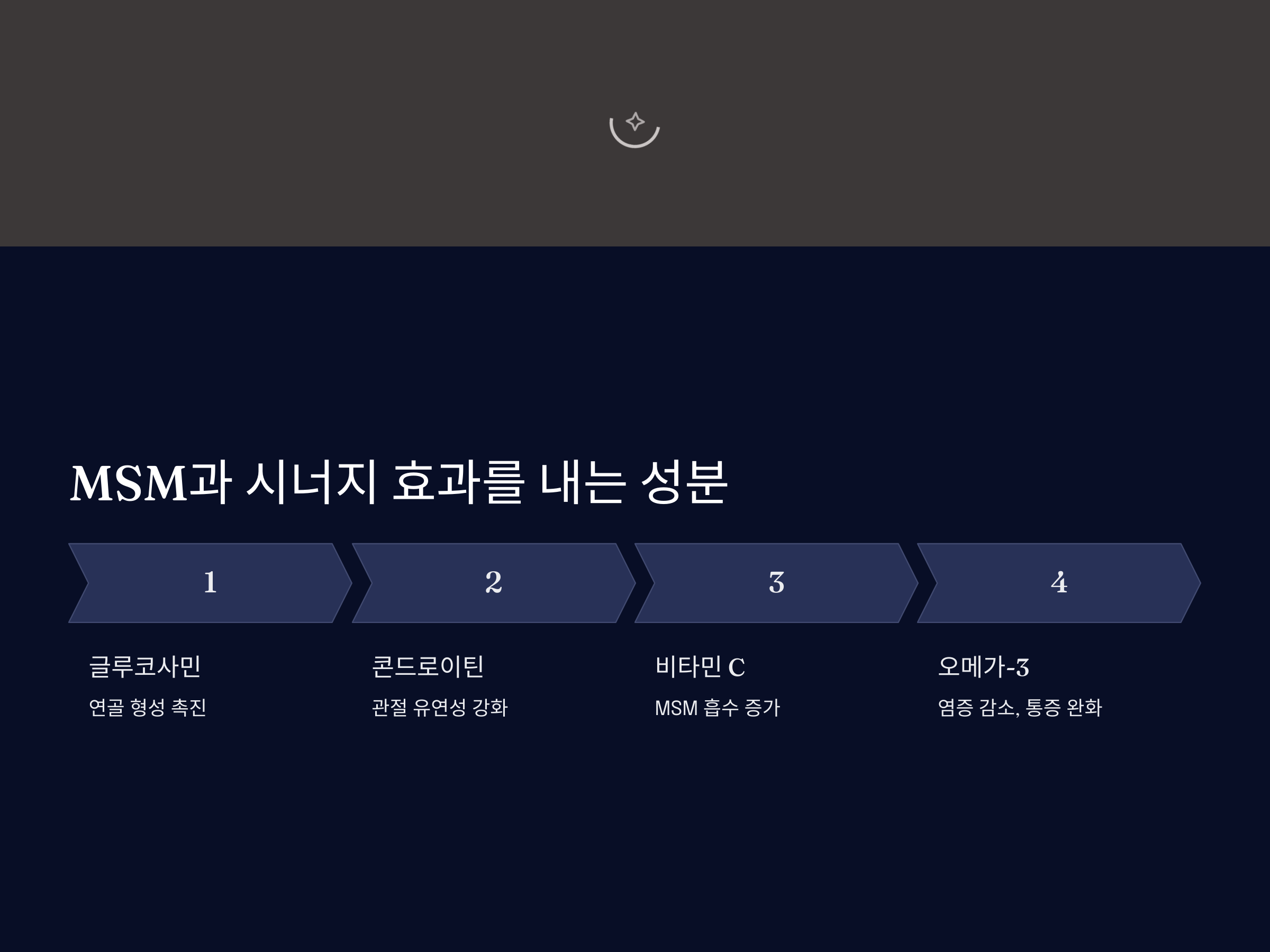 MSM은 단독으로도 효과적이지만, 다른 성분들과 함께 섭취할 때 시너지 효과를 낼 수 있습니다: